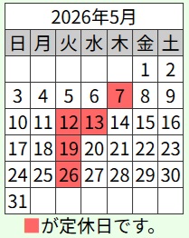 いつもご来店ありがとうございます。本年度の5月及び、GW期間中の営業についてお知らせいたします。下記のカレンダーをご参照ください。
